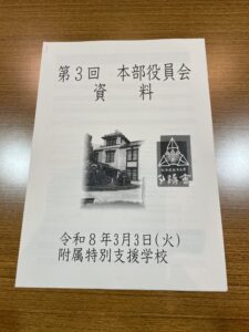 令和7年度第3回本部役員会が開催されました 2026.03.03 お知らせ 令和7年度第3回本部役員会が令和8年3月3日(火)に 附属特別支援学校において行われました。 役員会では、会務報告、母校学位記・修了証書授与式、母校入学式についての他、 総会・大懇親会案内、会員名簿、北海道教育大学函館校の改組にかかわる経過、 会長選考委員会について協議が行われました。 その後、各部長・各支部より、進捗状況等の報告が行われました。